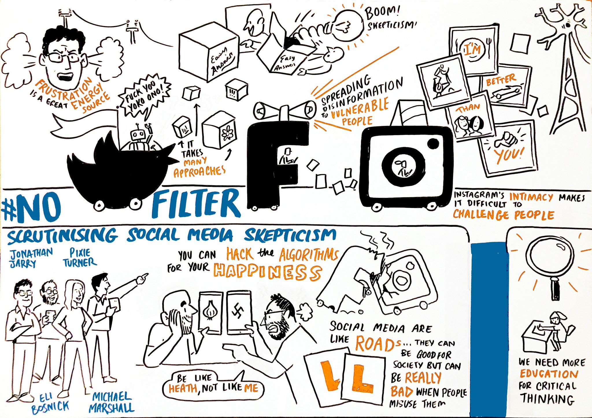Sociální média se stala jedním z nejvlivnějších komunikačních prostředků naší doby, schopny utvářet názory, ovlivnit volby, spustit revoluci. Nabízí skeptikům a popularizátorům vědy bezprecedentní možnosti, ale zároveň jsou hrozbou. Vydavatelé jako Natural News vypouští pseudovědecké nesmysly miliónům svých sledujících, zatímco příspěvky odhalující chyby v jejich argumentech dostávají jen zlomek pozornosti. Jak můžeme efektivně zatlačit zpět proti propagátorům špatných myšlenek - jak vně tak uvnitř skeptického hnutí? Panelisté jsou Jonathan Jarry, Eli Bosnick, Pixie Turner a předsedá Michael Marshall."