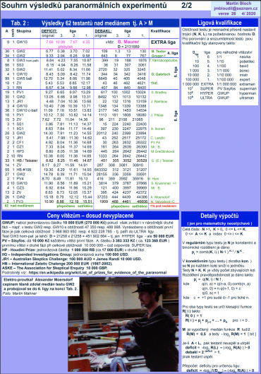 Testant M* ‘A’ převedl telepatický přenos 4-místného čísla v testu s parametry: N = 10000, K = 5, L = 2 při D = 10 002 000 (úžasné!) a M = 0,5. Tedy pravděpodobnost výsledku pro A = 0 je 0,9995, pro A = 1 je 0,0005, pro A = 2 je 0,0000001. To je extrémní pro předběžný test – odpovídá SUPER lize! Nedivu, že výsledek testu byl A = 0. Zjevně tento test byl chybně naplánován (ID = HM/A).