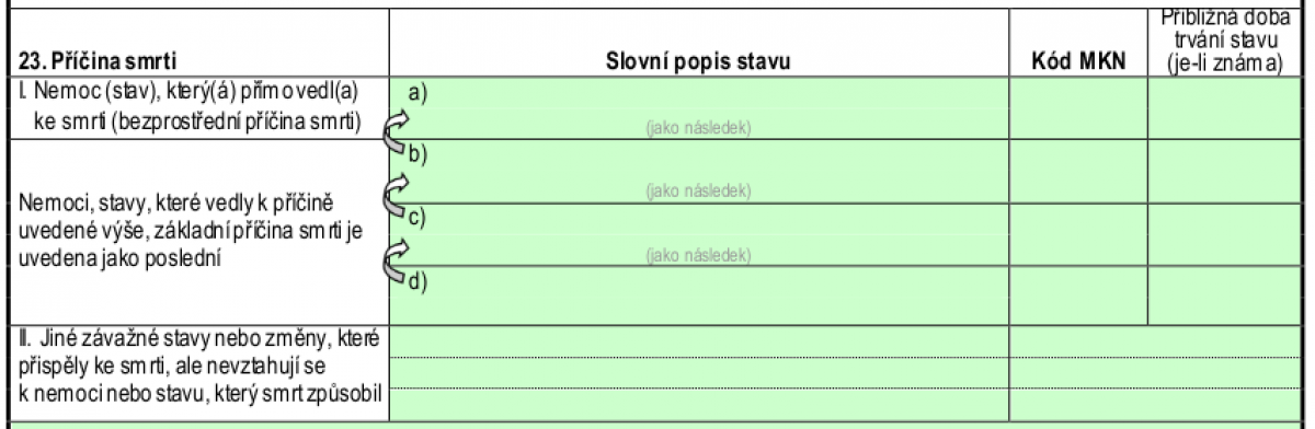 Pro zaznamenání příčiny smrti slouží kolonky 17 a 23, které mají stejnou strukturu. Do kolonky 17 vyplňuje svůj nález lékař, který prohlížel zesnulého, do kolonky 23 lékař, který zesnulého pitval: