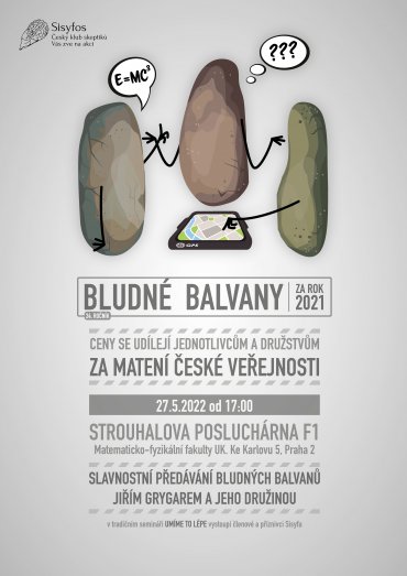Srdečně vás zveme na předávání Bludných balvanů, které se uskuteční ve Strouhalově posluchárně dne 27. 5. 2022 od 17:00. Na místě bude dobrovolné vstupné a možnost nás podpořit nákupem skeptických knih. Není třeba se na akci předem registrovat.