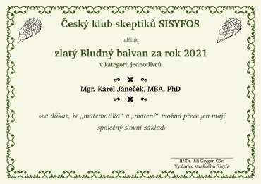 Komitét pro udělování Bludných balvanů při Českém klubu skeptiků SISYFOS oznamuje, že v kategorii jednotlivců za rok 2021 získává zlatý Bludný balvan Mgr. Karel Janeček, PhD, MBA, za důkaz, že "matematika" a "matení" možná přece jen mají společný slovní základ.