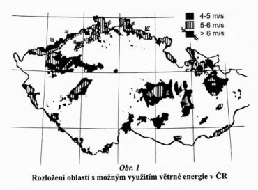 Technický potenciál větrné energie na území ČR je odhadován na úrovni 55,106 MWh ročně (v úrovni 10 m nad terénem). Obr. 1 ukazuje, které oblasti jsou pro využití větrné energie perspektivní. Technicky realizovatelný potenciál se pohybuje na úrovni 10 % z technického potenciálu. Při ročním využití instalovaného výkonu 16 % by celkový výkon dosáhl cca 400 MW a bylo by nutno vztyčit téměř 800 strojů s jednotlivým výkonem kolem 500 kW. Pro srovnání - aby instalovaný výkon větrné energetiky mohl aspirovat na dosažení současné úrovně výkonu vodních elektráren u nás, musel by se pohybovat na instalované úrovni 3000 - 3300 strojů (jednotkový výkon 500 kW, 16 % využití instalovaného výkonu).