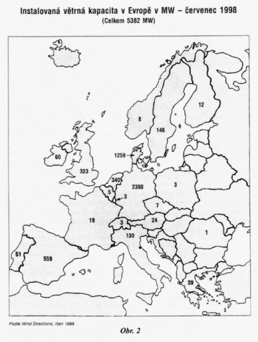 V současné době je zatím největší instalovaný výkon větrných elektráren v Německu; jde o 2380 MW s převahou instalace ve větrně vydatných přímořských oblastech. Celkem je zde postaveno 5630 strojů (o jednotkovém výkonu 5 - 1500 kW). Rozloha Německa je přibližně 4,5x větší než ČR. Jaká je současná instalovaná kapacita větrných elektráren v Evropě, ukazuje obr. 2.