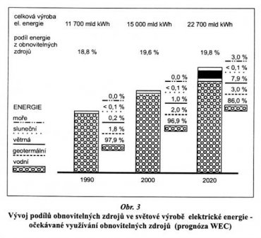 Publikované prognózy pro rok 2020 napovídají, že při poklesu světových zásob ropy a zemního plynu a po překonání řady současných technických a zejména ekonomických problémů by se do roku 2040 - 2060 měly podstatněji rozvíjet obnovitelné zdroje pro získávání elektřiny a tepla (Obr. 3, prognózy World Energy Council, Shell aj.).