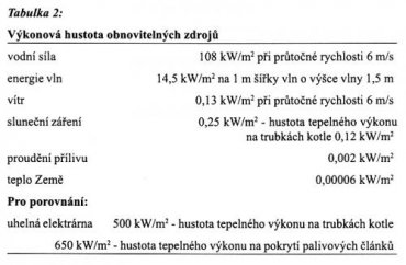 V tab. 2 jsou uvedeny výkonové hustoty jednotlivých zdrojů za specifikovaných podmínek. V našich středoevropských poměrech je sice zajímavá energie větru a slunečního záření, ale jak vidíme v tabulce, výkonové hustoty těchto zdrojů jsou obecně velmi nízké a vynucují si nárůst rozměrů zařízení, sloužících pro koncentraci tohoto rozptýleného energetického toku a jeho následné využití k přeměně na energii elektrickou.