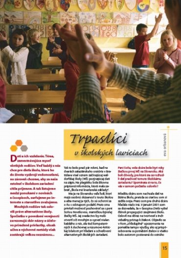 Deti a ich vzdelanie. Téma, zamestnávajúca myseľ všetkých rodičov. Veď každý z nás chce pre dieťa školu, ktorá ho do života vyzbrojí vedomosťami, no zároveň chceme, aby sa naša ratolesť v školskom zariadení cítila príjemne. A tak listujeme medzi ponukami v novinách a časopisoch, surfujeme po internete a starostlivo zvažujeme. Mnohých rodičov tak oslovili práve alternatívne školy. Spočiatku v povedomí verejnosti zarezonujú skôr názvy a účelovo priradené prívlastky, obsah učiva a výchovné metódy však zostávajú veľkou neznámou...