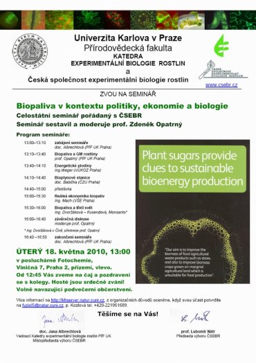 si dovolujeme pozvat na odpolední seminář pořádaný Katedrou experimentální biologie rostlin PřF UK v Praze a CSEBR (www.csebr.cz) s názvem