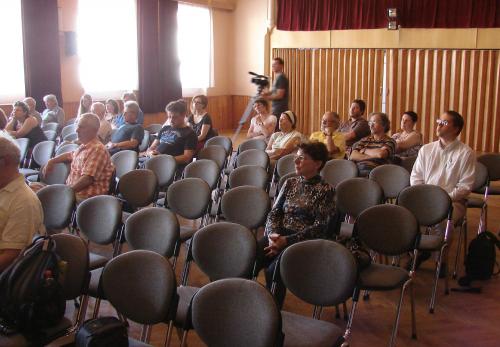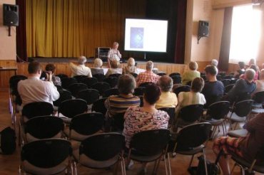 Po společném obědě v klimatizované restauraci Pálava se přiblížil hlavní bod programu, přednášky pro veřejnost (Kulturní dům Hustopeče od 14 do 18 hodin). Před zahájením natáčela městská televize rozhovor s přednášejícími (záznam naleznete na http://youtu.be/OsirfD96z0w).