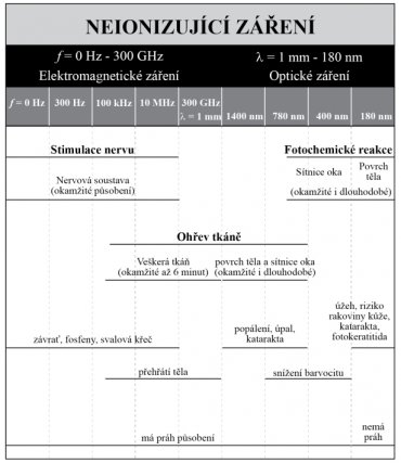 Obr. 2 Schématický souhrn známých zdravotních efektů neionizujícího záření. Nepřekročení expozičních limitů navržených komisí ICNIRP s rezervou zamezuje projevům těchto efektů na zdraví exponované osoby. Je zajímavé uvést, že všechny tyto zdravotní efekty byly známy již před rokem 1960. Od té doby se i přes enormní vědecké úsilí žádný nový zdraví ohrožující efekt objevit nepodařilo. Pozn.: Hranice 180 nm mezi neionizujícím a ionizujícím zářením byla určena dohodou a není absolutní. Například krátkovlnné ultrafialové záření je již s to ionizovat atomy některých kovů.